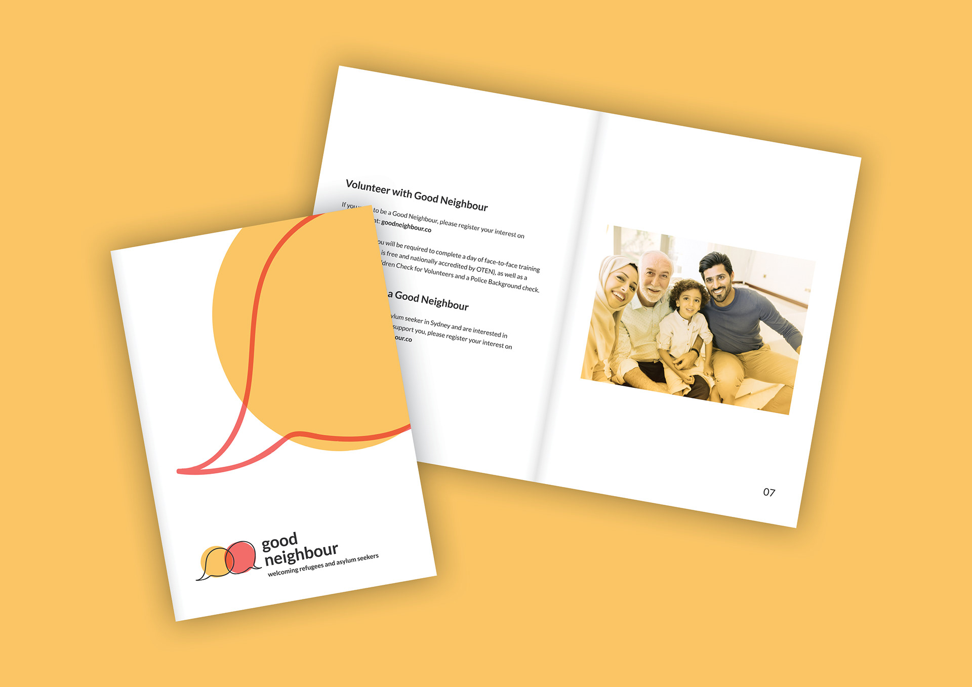 Good Neighbour is a non-religious, Australian organisation that aims to link trained volunteers with newly arrived refugees, asylum seekers and their families. A complete brand identity was created for Good Neighbour as part of unit ‘87665 VC Project: Socially Responsive Design’, which saw groups of UTS students partnered with non-profits in need of design. We worked with Nicole Yade, the founder of Good Neighbour, to identify her organisation’s values, tone of voice and visual identity; culminating in the design of a logo, style guide, and collateral including: brochures, tote bags, posters, business cards, social media accounts and a website.